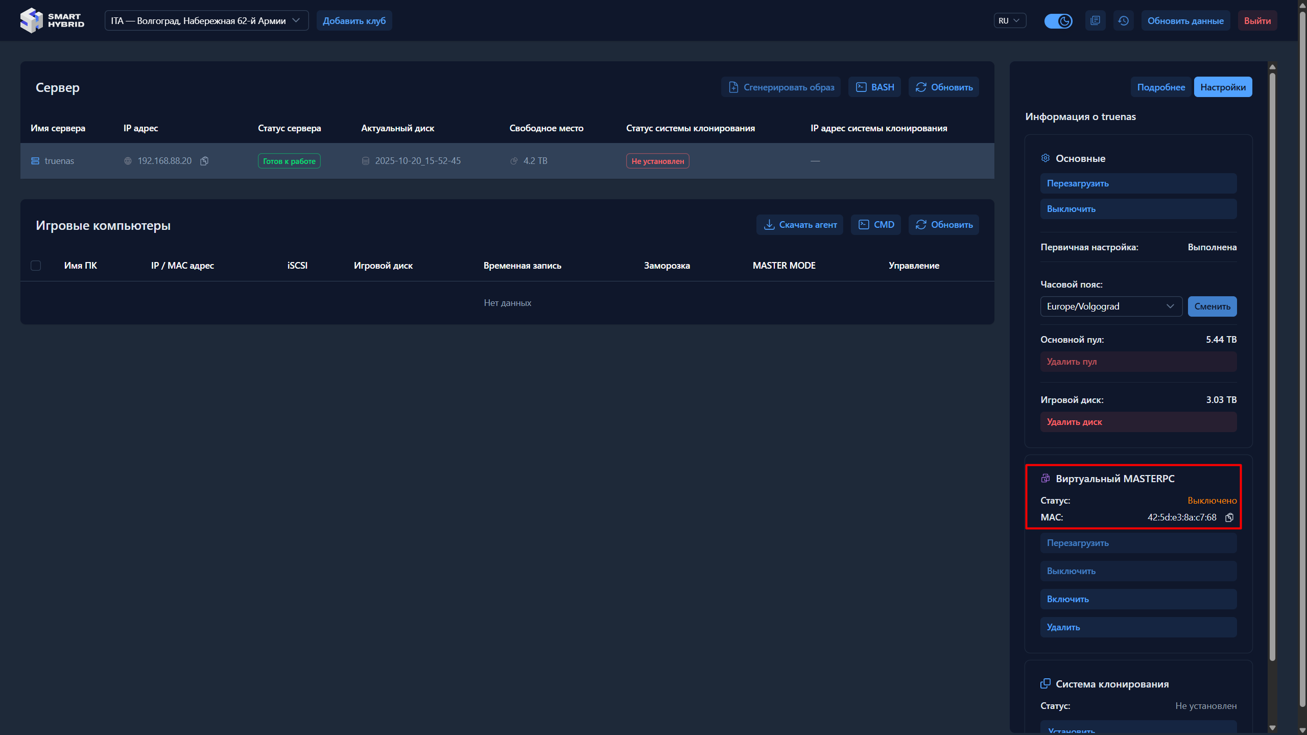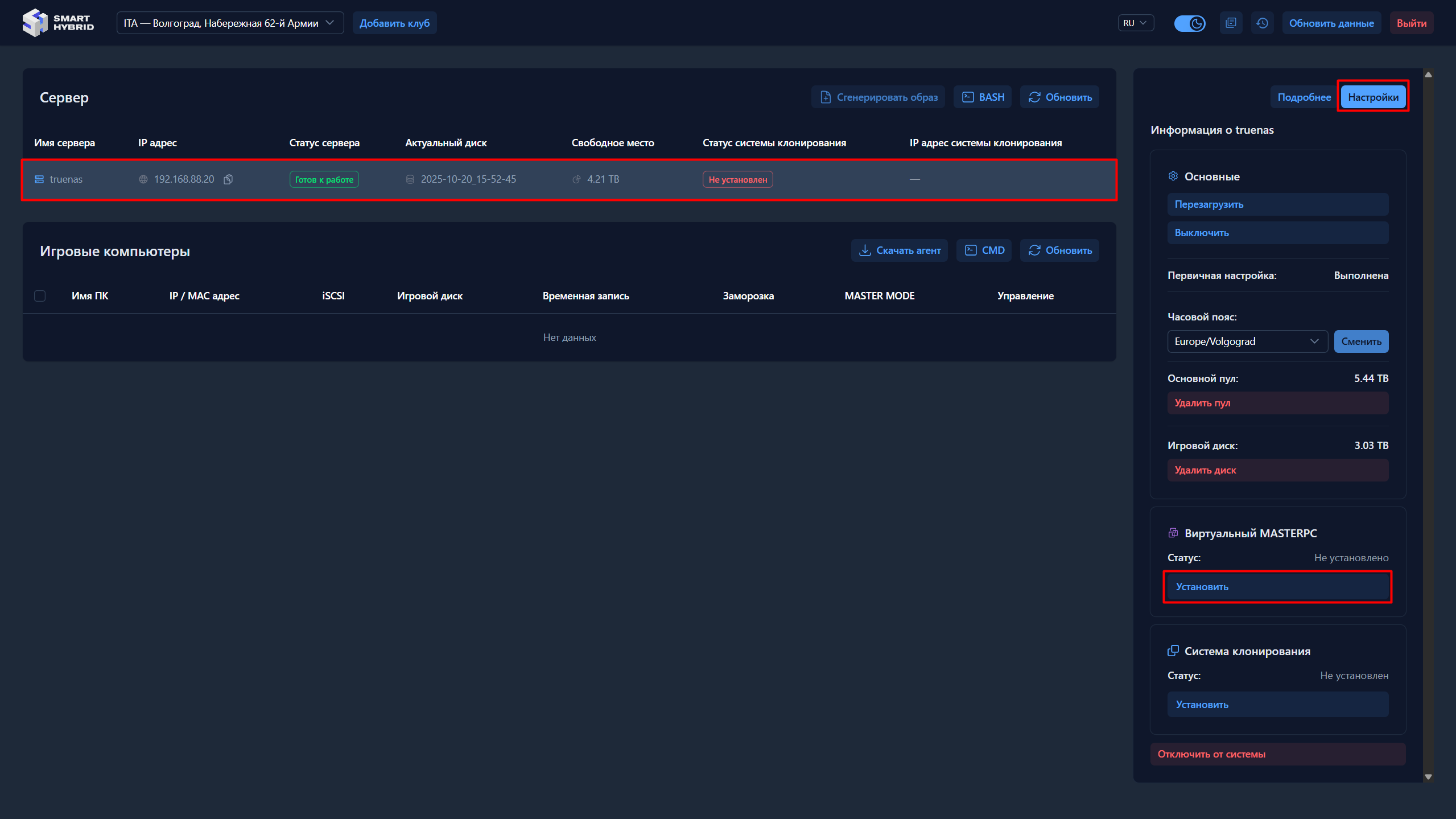 Для установки MASTERPC зайдите в настройки TrueNAS и в блоке "Виртуальный MASTERPC" выберите Установить