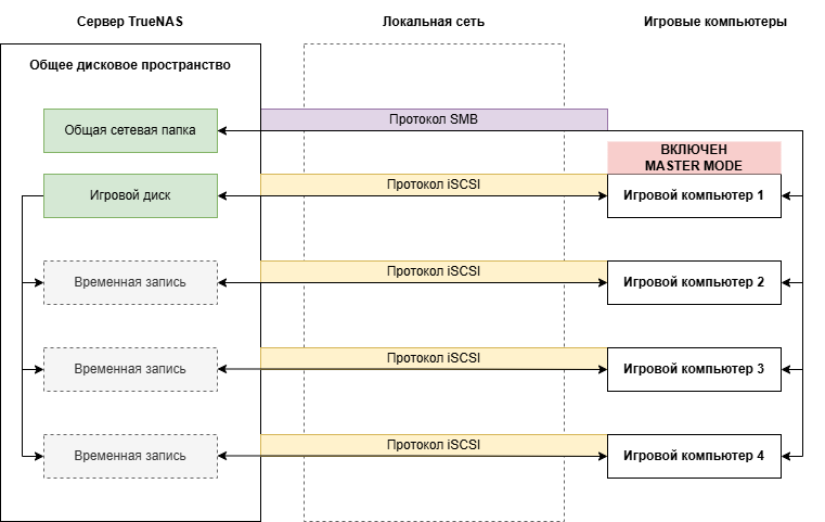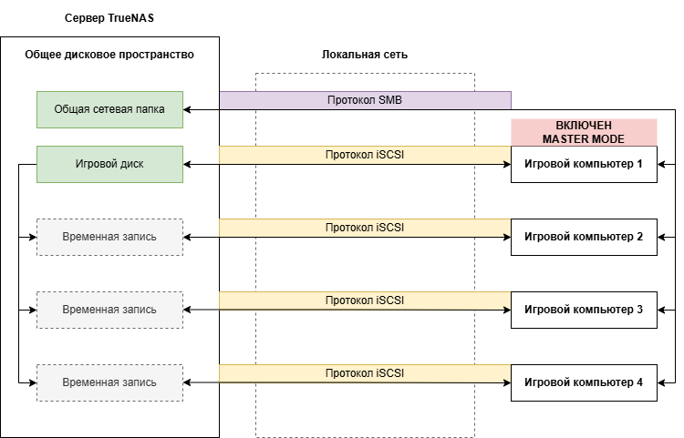 В ниже указанной схеме на первом компьютере включен режим MASTER MODE для демонстрации, что в этом режиме компьютер пишет изменения напрямую в Игровой диск, а не во временную запись, как в обычном режиме на любом игровом ПК. После выключения режима MASTER MODE, компьютер будет писать данные во временную запись, а не напрямую в игровой диск.